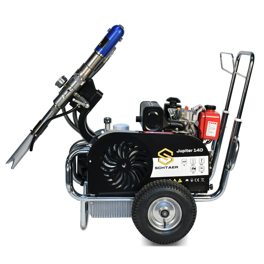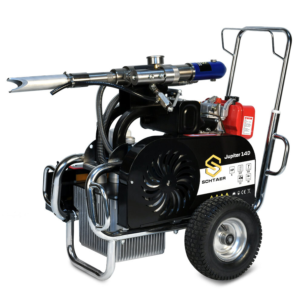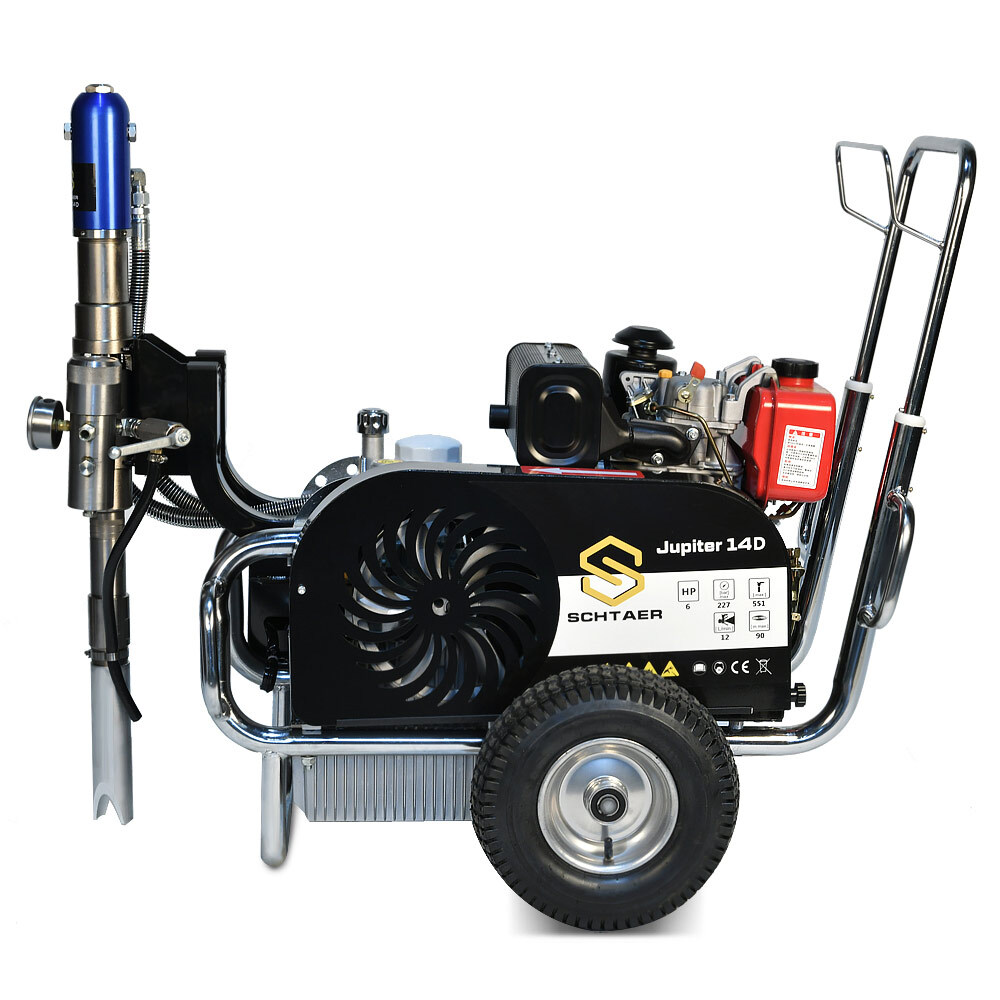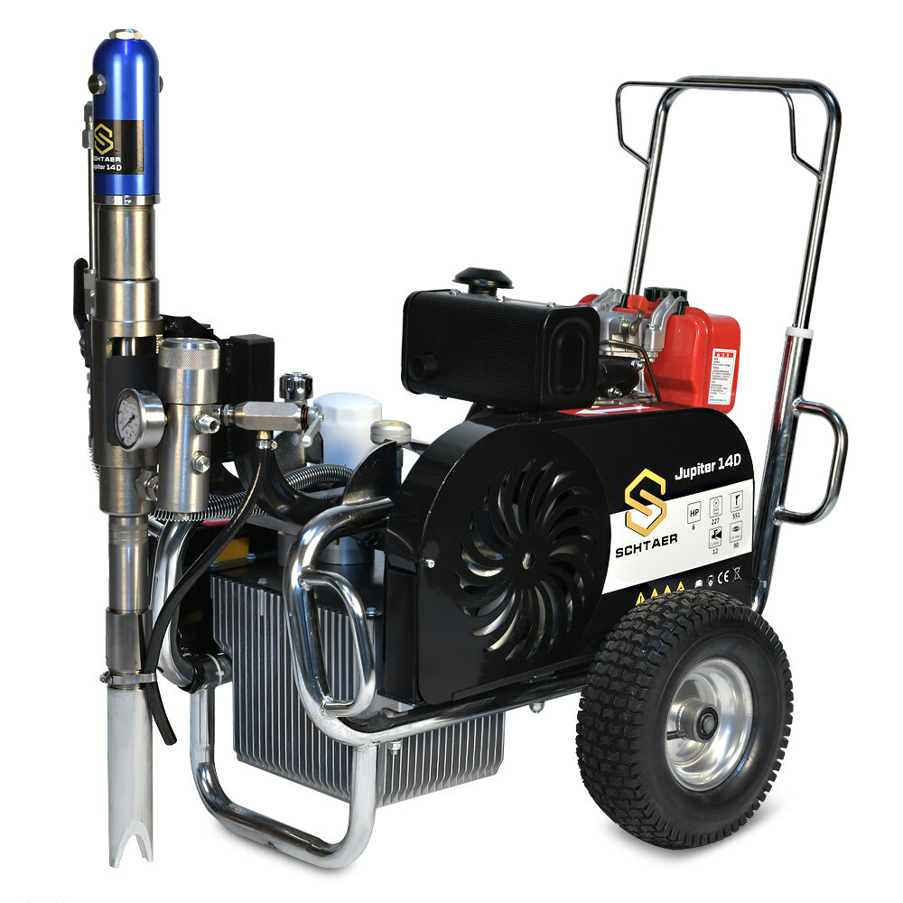 Schtaer Jupiter 14D – это безвоздушный дизельный окрасочный аппарат, предназначенный для распыления красок с высокой степенью вязкости. Его также используют при работе с огнезащитными составами, гидроизоляционными материалами, антикоррозионными красками, шпатлевками, цинконаполненными материалами, эмалями, мастиками, грунтовками и другими лакокрасочными материалами, предназначенными для нанесения через поршневой безвоздушный окрасочный аппарат. Сферы применения этой модели разнообразны. Ее используют для покраски стен, фасадов и потолков, металлических конструкций, бассейнов, крыш и куполов. Она может применяться при работе с балками, заборами, мостами и тоннелями, изготовленными из металла. Профессиональный аппарат подходит для нанесения дорожной разметки, но при этом потребуется дополнительное оборудование. Модель обладает высокой производительностью (14 л/мин), работает под давлением 230 Бар при мощности 4 000 Вт.