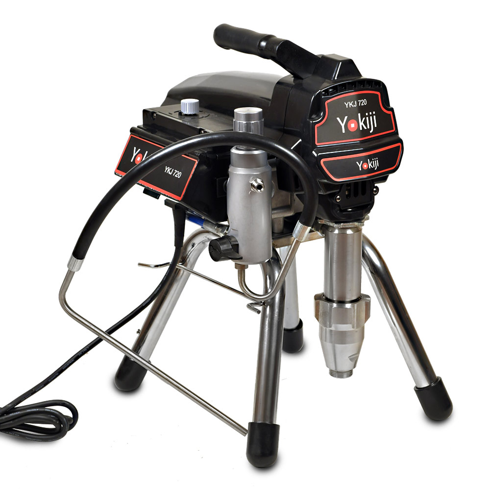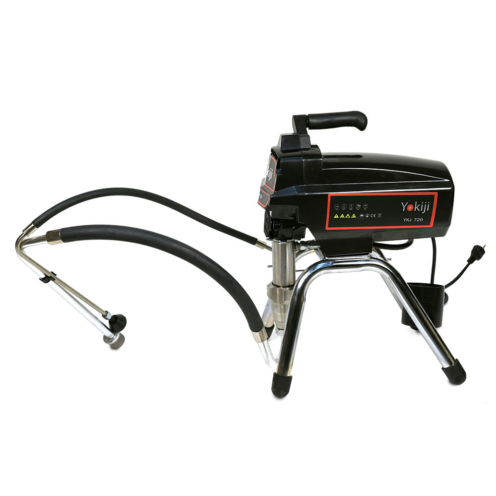 YOKIJI YKJ 720 – компактный поршневой безвоздушный окрасочный аппарат с удлиненным поршнем; предназначен для высококачественной интерьерной окраски: работает с интерьерными красками низкой и средней вязкости. Также применяется для окраски фасадов и металлических и деревянных конструкций. Аппарат работает по принципу безвоздушного распыления: материал подается от окрасочного агрегата через краскопульт для безвоздушного распыления под высоким давлением. YKJ 720 оснащен электронной регулировкой давления и дополнительным фильтром, установленным на корпусе окрасочного аппарата.